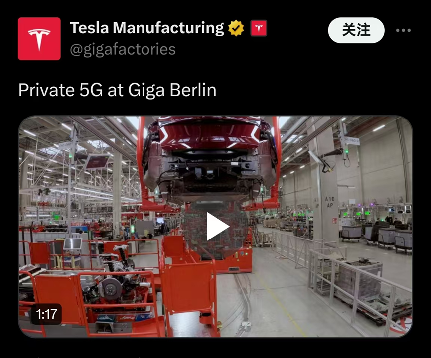 2024年5月,特斯拉通過社交網(wǎng)絡(luò)X(原Twitter)發(fā)布了一個短視頻,展示了在其柏林工廠部署的5G專網(wǎng)場景。實(shí)際上,該專用網(wǎng)絡(luò)在2023年已開始部署,一直處于概念驗(yàn)證(PoC)模式,知道2024年5月才開始運(yùn)行。