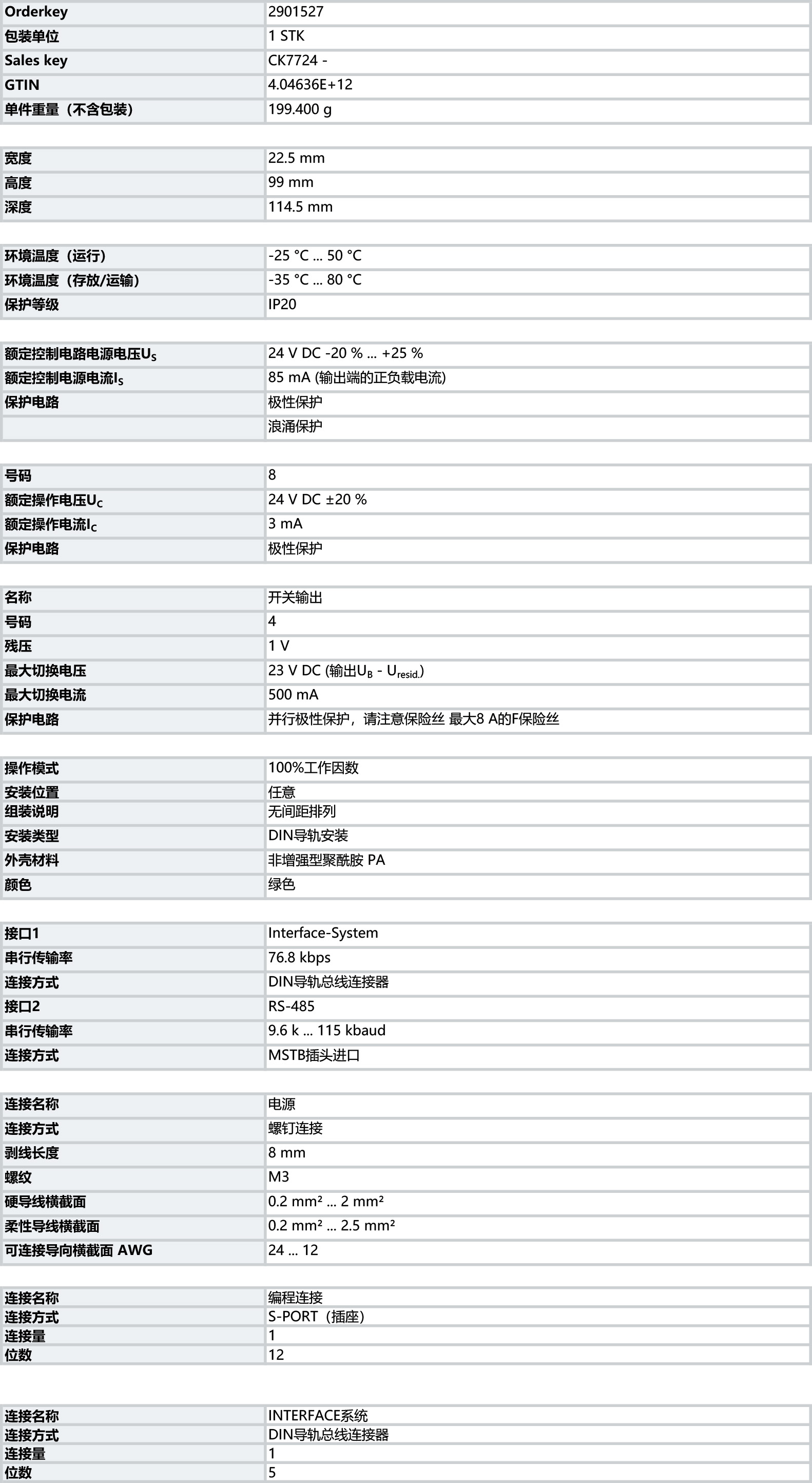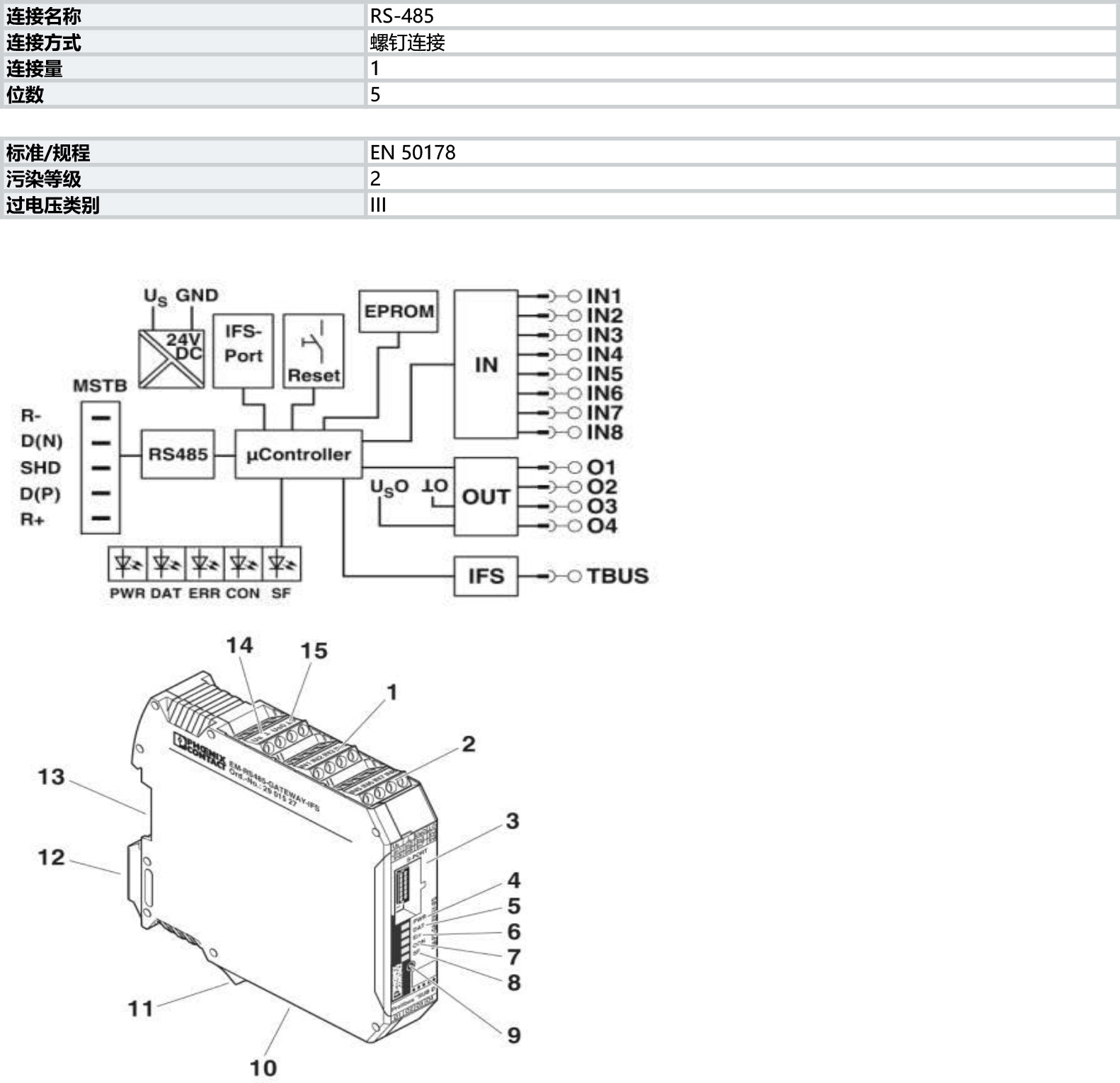 網關,用于通過Modbus/RS-485將最多32臺INTERFACE系統設備連接到上級控制器。INTERFACE系統設備通過DIN導軌連接器連接到網關,提供DIN導軌連接器。